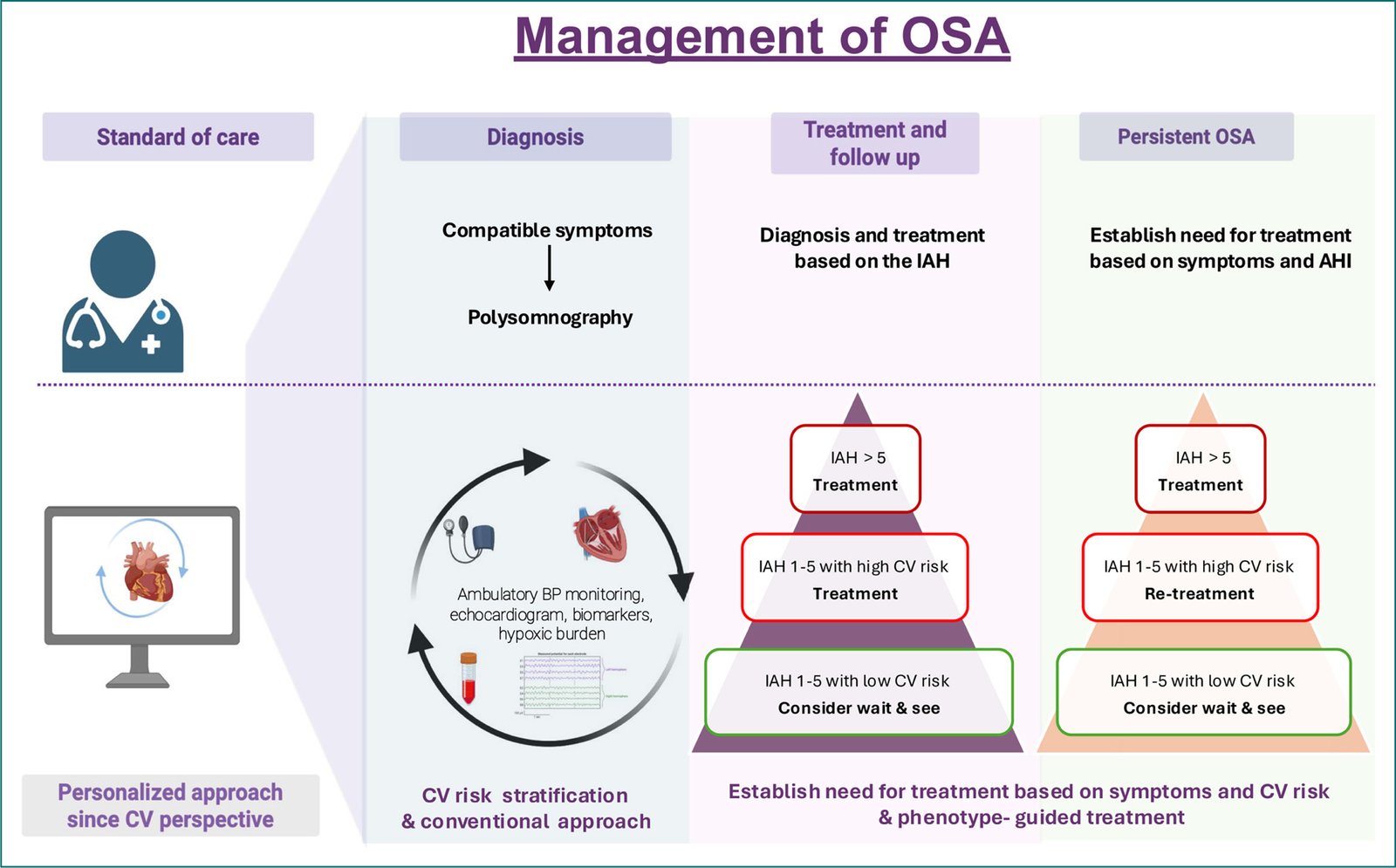 Given the complexity of the disease and the vulnerability of the pediatric population, addressing OSA in children requires a holistic approach. We propose a strategy that goes beyond merely focusing on symptoms and traditional diagnostic methods. Instead, it should incorporate innovative tools that can provide insights into future CV risks and inform clinical decision-making. This approach to risk stratification can help reinforce treatment in some instances, avoid unnecessary interventions in children with mild-moderate OSA with low CV risk, or reassess the best alternative treatments for those whose risks or symptoms persist despite initial treatment. Figure 3 compares the standard of care with the proposal from an innovative CV perspective.